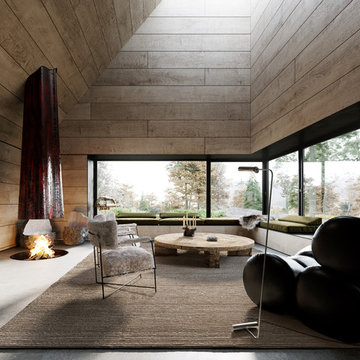 Trendy concrete floor and gray floor living room photo in New York with brown walls and a wood stove